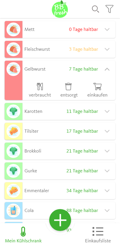 Der Wireframe wird nun als Prototyp umgesetzt und erste Funktionen programmatisch mit Flutter (Dart) umgesetzt. Über die Suchleiste können bestimmte Produkte im Kühlschrank gesucht werden. Über den Filter können beispielsweise alle Sorten Gemüse gefiltert und angezeigt werden. Klappt man ein Produkt über die Pfeile rechts aus hat man mehrere Auswahlmöglichkeiten. Das Lebensmittel kann verbraucht, entsorgt und/oder auf die Einkaufsliste hinzugefügt werden.