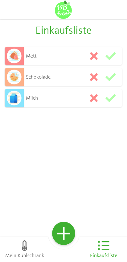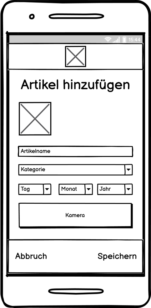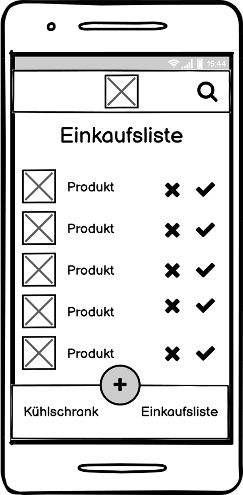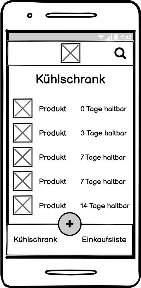 Zuvor erstellte Skizzen werden in einen Wireframe umgesetzt. Links zeigt eine Übersicht über den Kühlschrank, die Produkte und das Ablaufdatum in Tagen. Die Liste soll nach Haltbarkeit sortiert werden. Über den Plus-Button können, wie die mittlere Abbildung zeigt, neue Produkte hinzugefügt werden. Entweder gibt man die Daten manuell an und fügt ein Foto hinzu oder man scannt mit der Kamera das MHD ab. Falls ein Produkt leer wird, kann dies einfach über die Liste rechts auf den Einkaufzettel hinzugefügt und verwaltet werden.