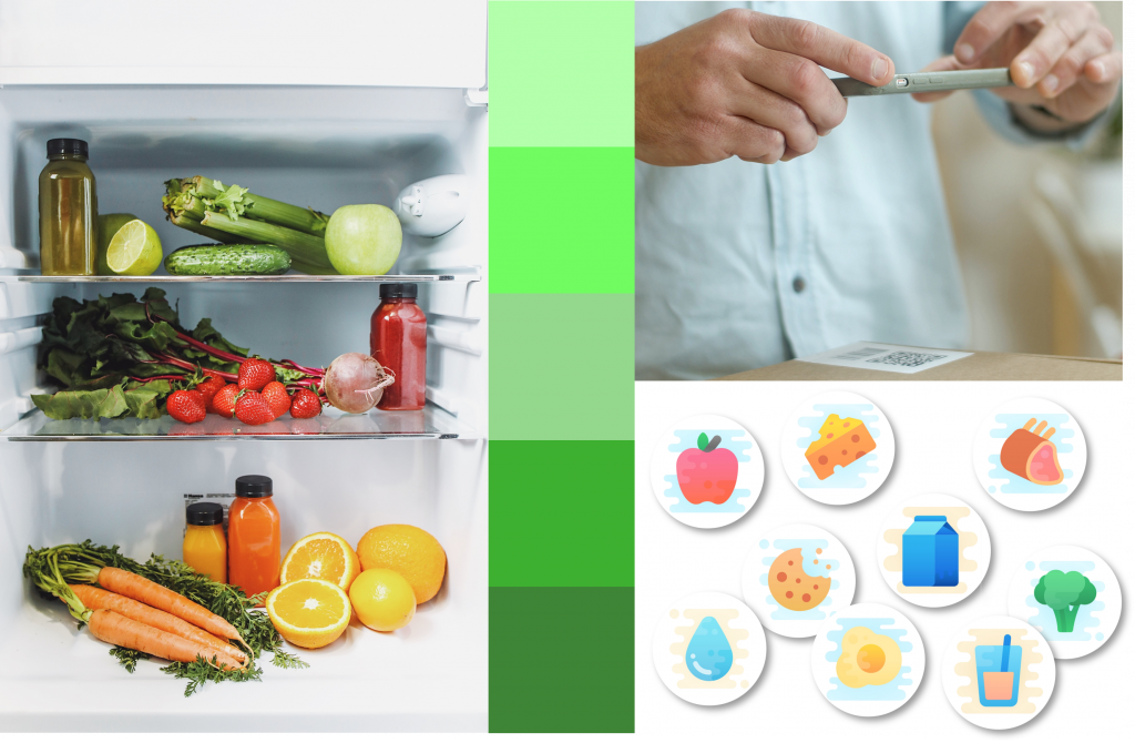 Im ersten Ansatz wird ein Moodboard zum Thema: Gesundheit, Essen und smarte Anwendungen erstellt. Der Kühlschrank ist aufgeräumt, dadurch kann der Überblick behalten werden. Die verschiedenen Grüntöne suggerieren gesundes und frisches Essen. Ein Nutzer scannt einen Code mit dem Smartphone ab, diese Funktion soll am Ende des Projektes in der Applikation umgesetzt werden. Die Icons stellen beispielhaft verschiedene Lebensmittel dar.